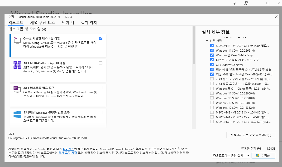 우측의 설치 세부 정보에서 MFC가 있는 체크박스를 클릭하여 하단의 [수정] 버튼을 눌러 설치해 준다.