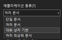 어플리케이션 종류에서 단일문서, 여러문서, 대화상자 기반등이 있는데