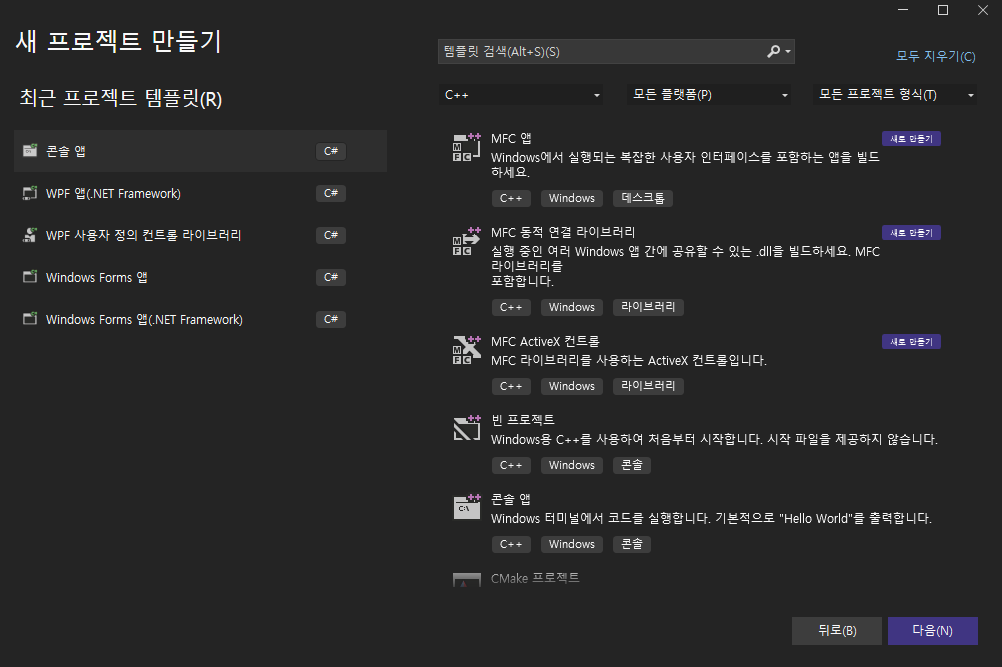 C++ 로 새 프로젝트 만들기를 해서 mfc를 검색했는데 아무것도 나오지 않았다...